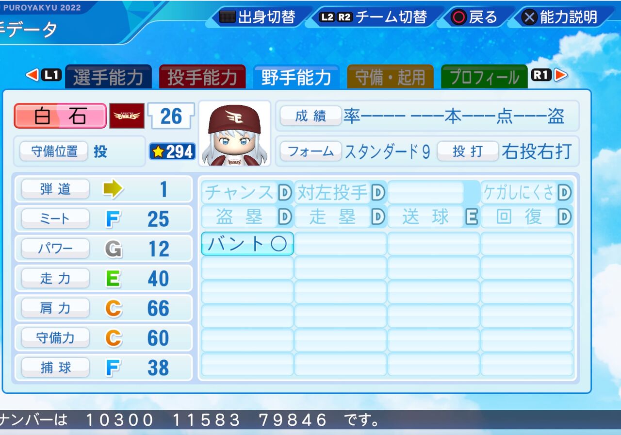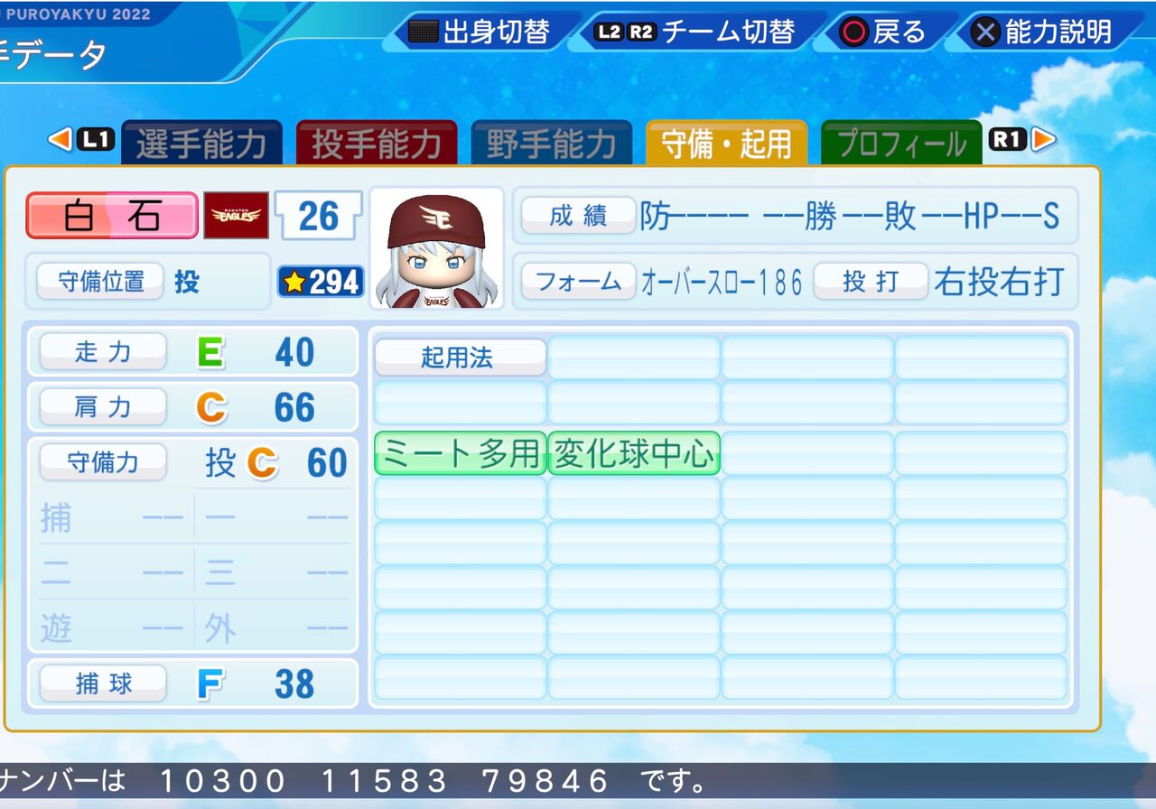 マイナス特殊能力は多めだが高いコントロールと変化の大きいスライダーが武器の先発投手です。以前作成したものはこちらから。