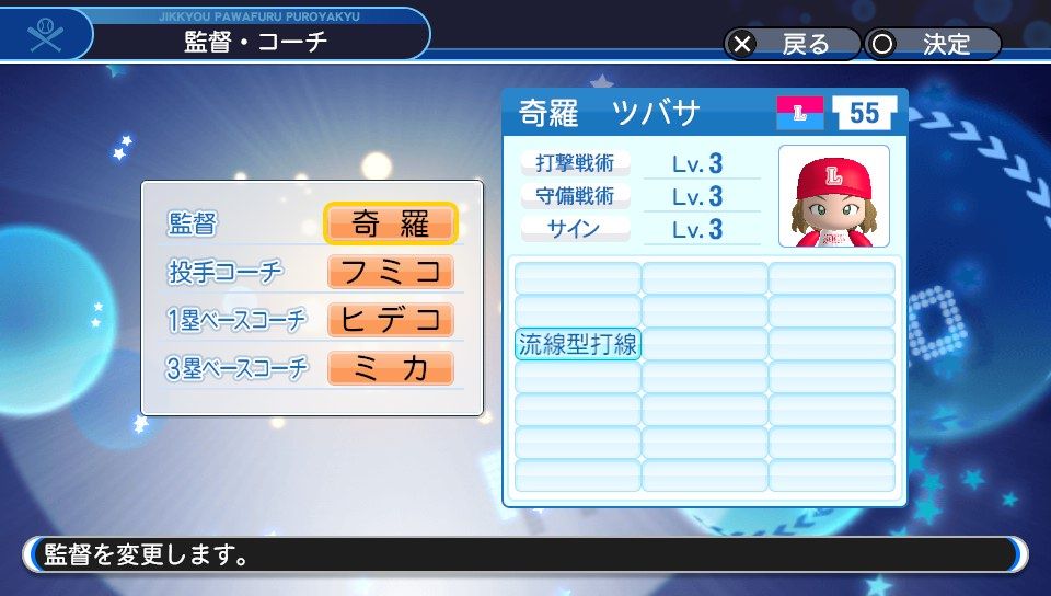 監督は選手兼監督という形になりますが、綺羅ツバサにしてます。(監督専業で該当しそうなキャラが思い当たらないため。ご自由に変更しても構いません。)コーチは2018版に引き続きヒフミトリオ(ラブライブに登場するキャラ)にしてます。また、よいつむトリオ(ラブライブサンシャインのキャラ)でもOKです。配置についてはイメージで決めました。