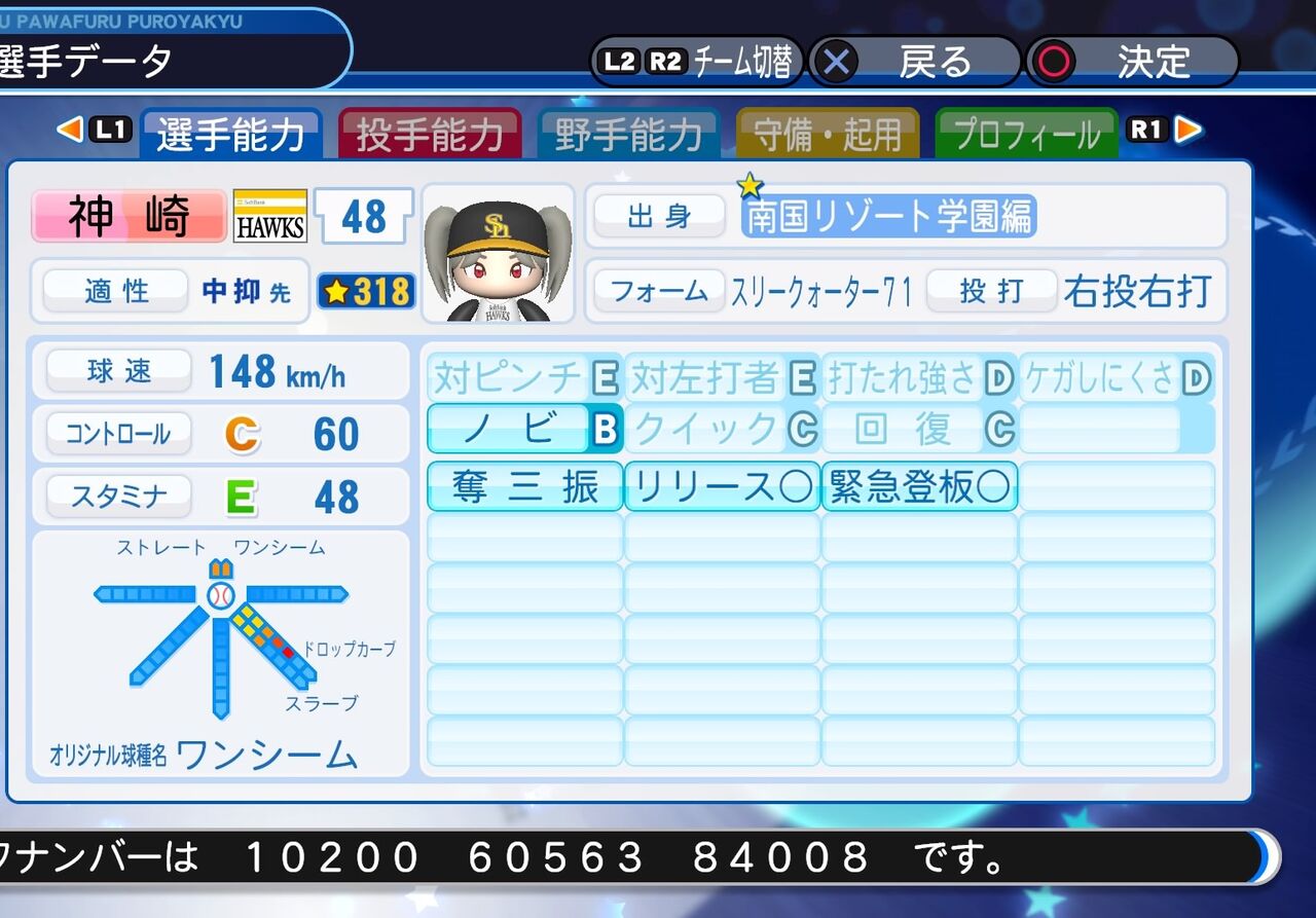 コントロールは下がってますが、球速が大幅に上がっています。修正前はこちらから。