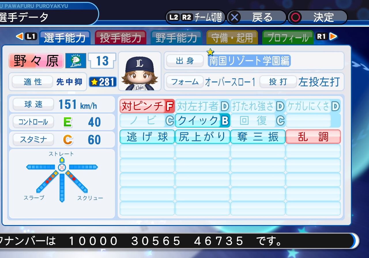 コントロールがやや低くピンチ時に弱いが球速が速めのサウスポー投手です。