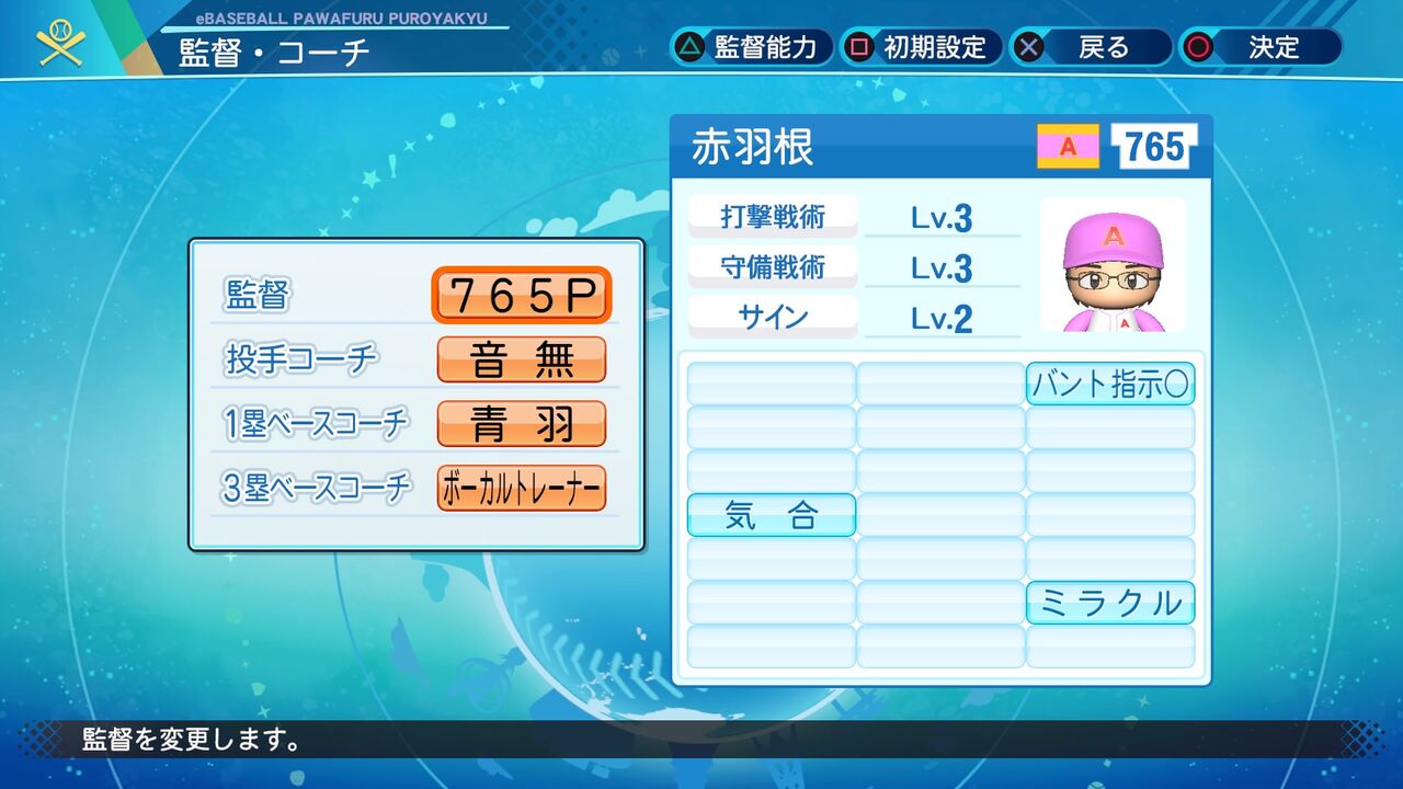 監督、コーチは2019年度版と変更はありません。(ただ、登録名が10文字まで入力できるようになったためVo.トレーナーからボーカルトレーナーに変更しています。)