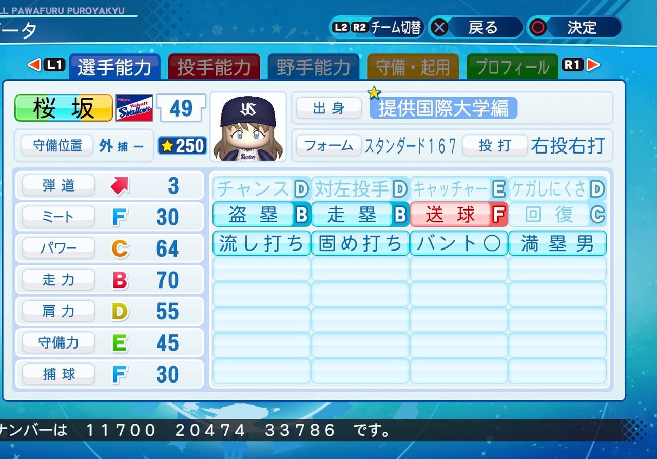 走力は高めですが、球技が苦手のためミートと捕球が低めの能力です。また、よびかたはおうさかやしずくは無かったためおおさかにしてます。以前作成したものはこちらから。