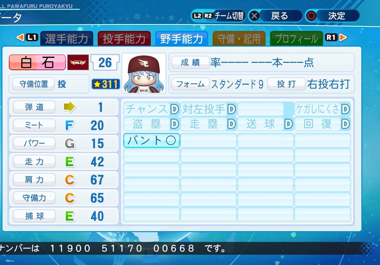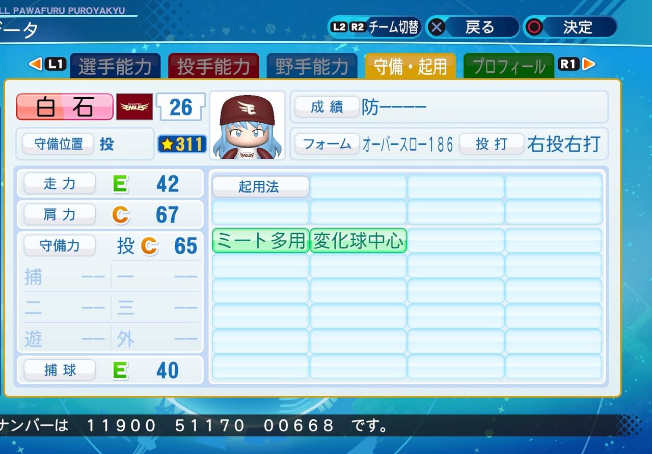 マイナス特殊能力は多めだがコントロールが高く、球持ち○が付いている先発投手です。以前作成したものはこちらから。(投手に変更しました。)