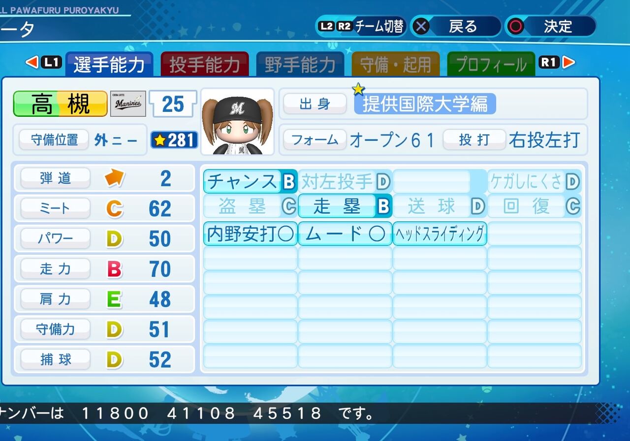 2021年01月16日 高槻 やよい パワプロ2020版 元気いっぱいで面倒見がよく家族思いのアイドルです。 走力が高く、ムード○が付いている外野手です。以前作成したものはこちらから。打撃フォーム 赤星(阪神OB)パワター選手データの画像ファイル 「アイマス パワプロ2020」カテゴリの最新記事 タグ :#外野手#765プロAS#プロジェクトルミナス#アイマス黄属性 < 前の記事次の記事 > コメント コメントフォーム 名前 コメント 記事の評価 リセット リセット 顔 星 情報を記憶 コメントを投稿する