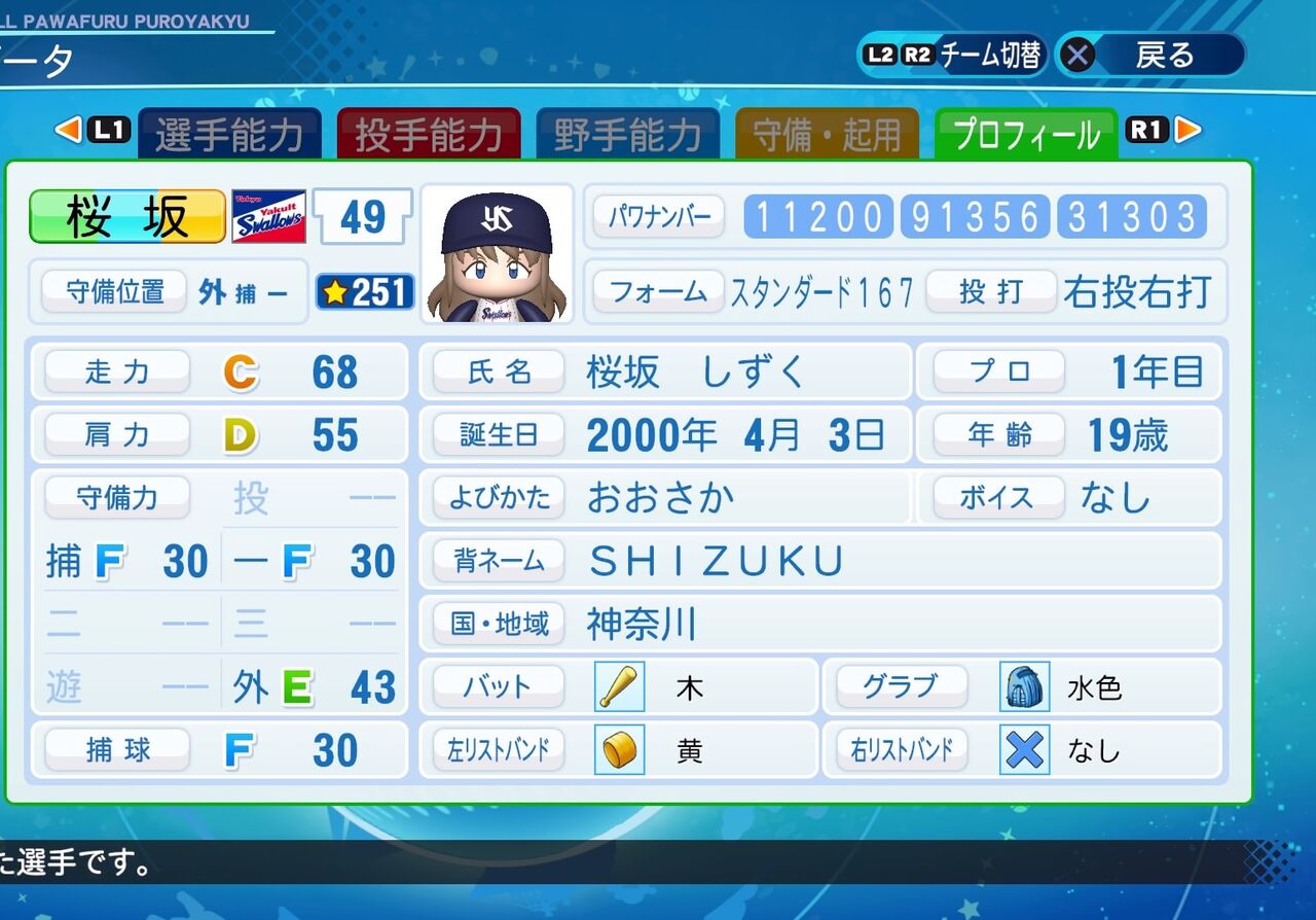 修正前と比べて走力と守備力が少し下がっており、一部特殊能力が変化してます。また、実家が鎌倉にあるということで出身地を神奈川に変更しました。以前作成したものはこちらから。