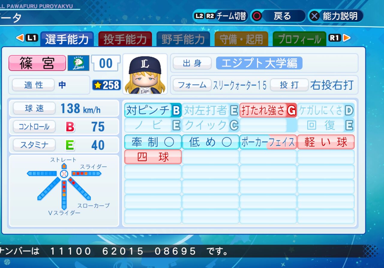 打たれ弱いですがコントロールが高く、ピンチに強いリリーフ投手です。以前作成したもの(野手)はこちらから。