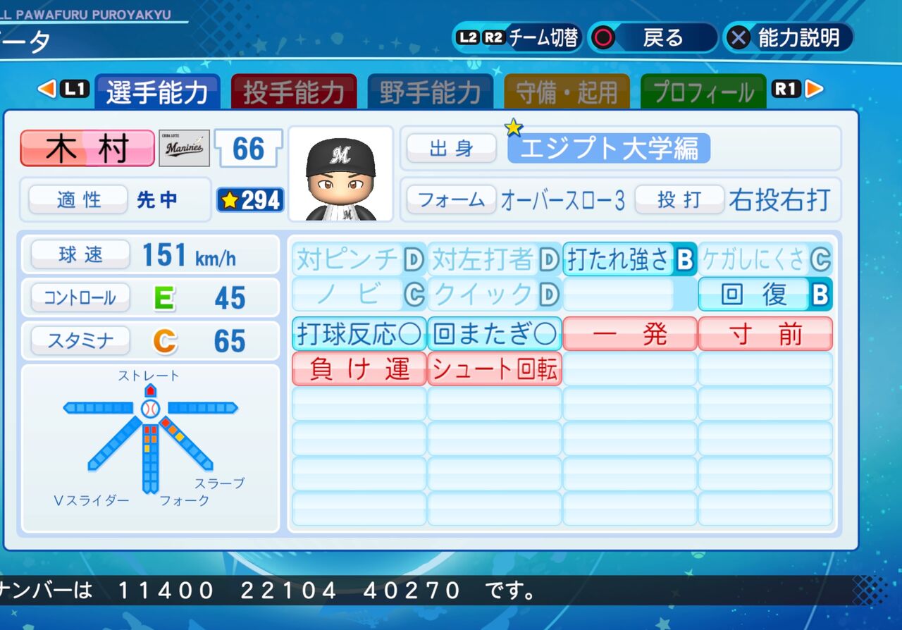 マイナス特殊能力は多めだが、球速が速く打たれ強い投手です。以前作成したものはこちらから。