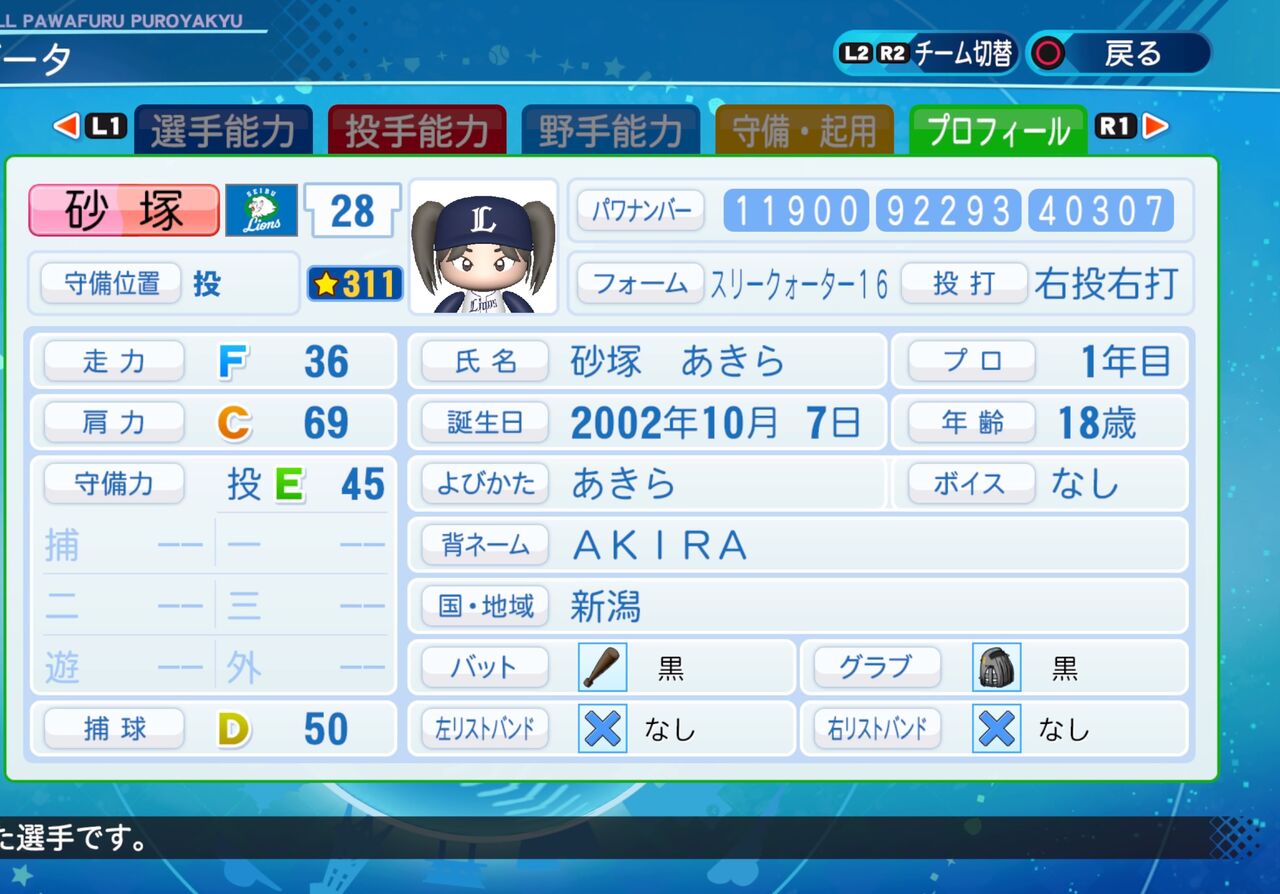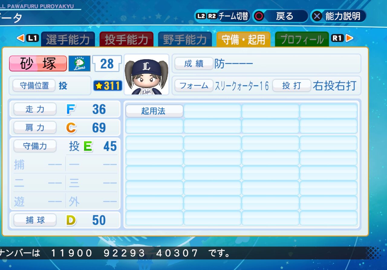 2022年02月25日 砂塚 あきら パワプロ2020版 ファッションとSNS、動画配信が趣味のアイドルです。 コントロールが高く、ノビ、キレともにいい投手です。パワター選手データの画像ファイル 「シンデレラガールズ パワプロ2020」カテゴリの最新記事 タグ :#投手(リリーフ)#346プロ#アイマス青属性 < 前の記事次の記事 > コメント コメントフォーム 名前 コメント 記事の評価 リセット リセット 顔 星 情報を記憶 コメントを投稿する