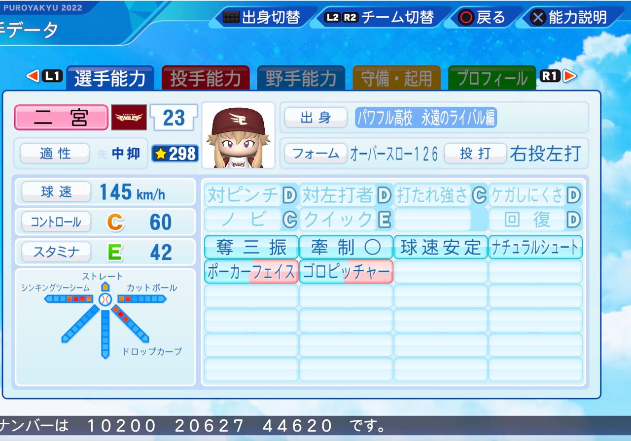シュート方向に変化するストレート持ちのゴロピッチャーです。以前作成したものはこちらから。(今回は左打にしてます。)