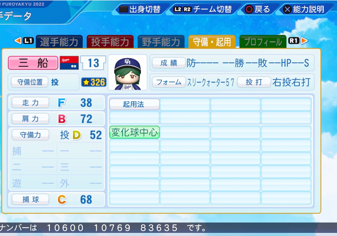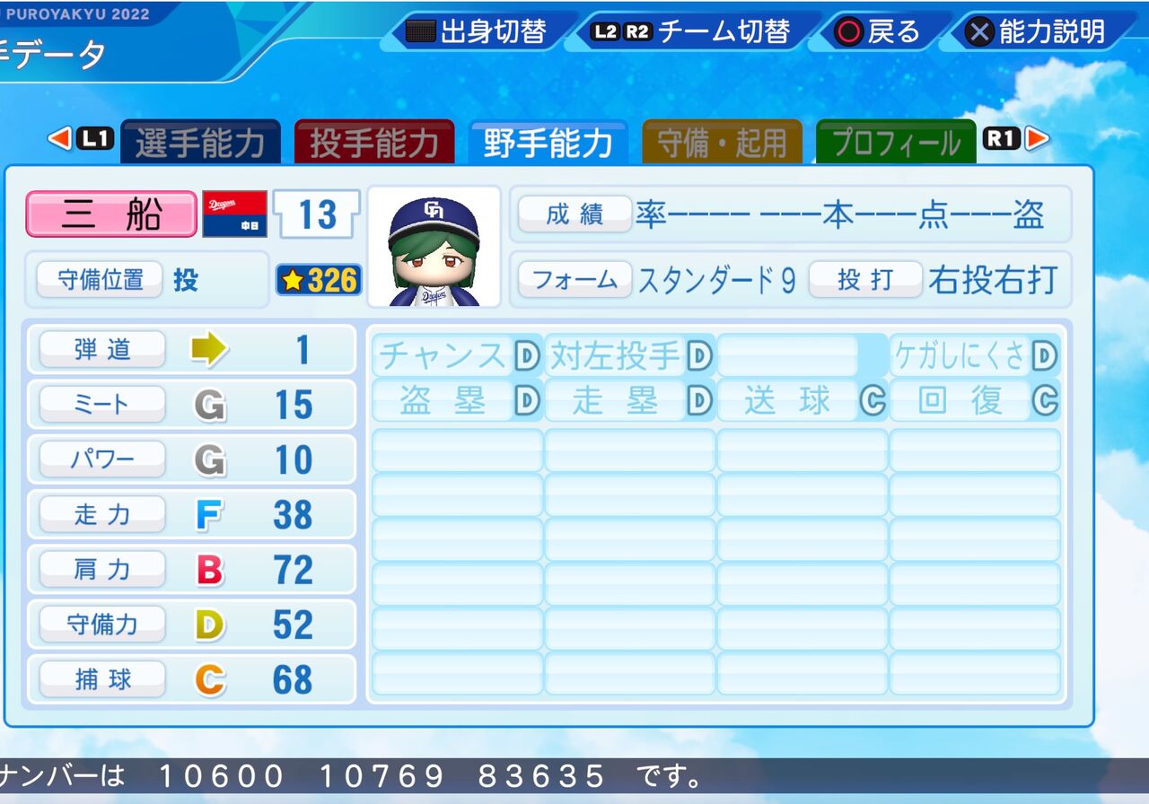 2022年09月22日 三船 栞子 パワプロ2022版 嵐珠(ランジュ)の幼馴染で真面目な性格のスクールアイドルです。 高いコントロールと変化の大きいHスライダーが武器のリリーフ投手です。なお、栞の字がなかったためひらがなのしおりにしてます。以前作成したものはこちらから。投球フォーム 岩瀬(中日OB)(変更しました。)パワター選手データの画像ファイル今日のプロ野球の結果DeNA 3 - 0 巨人ヤクルト 0 - 3 中日オリックス 5 - 13 ロッテ 「虹ヶ咲学園スクールアイドル同好会+スクフェスキャラ パワプロ2022」カテゴリの最新記事 タグ :#投手(リリーフ)#虹ヶ咲学園 < 前の記事次の記事 > コメント コメントフォーム 名前 コメント 記事の評価 リセット リセット 顔 星 情報を記憶 コメントを投稿する