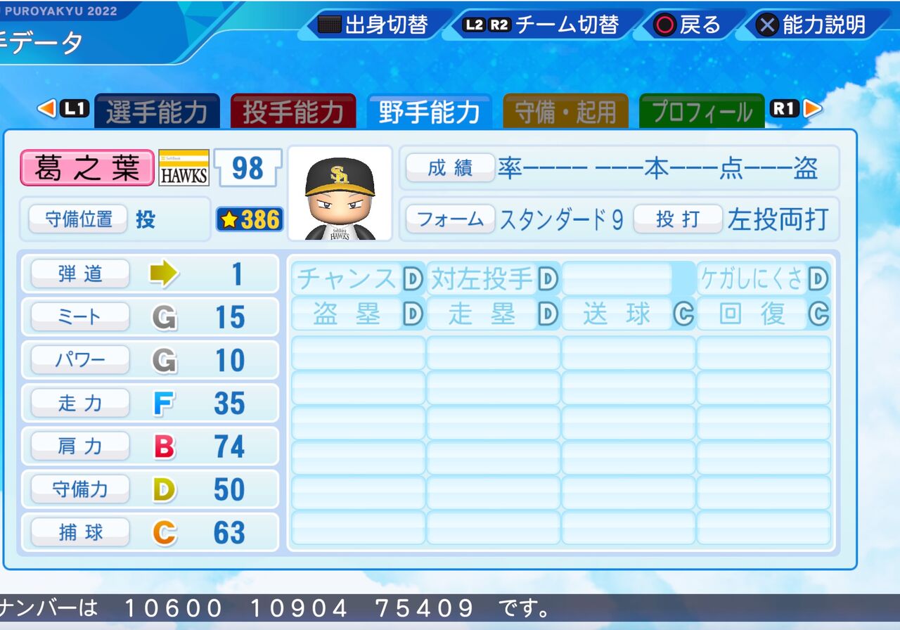 対ピンチ、対ランナー、要所〇など特定の条件下でで発動する特殊能力を多くもつリリーフ投手です。以前作成したものはこちらから。