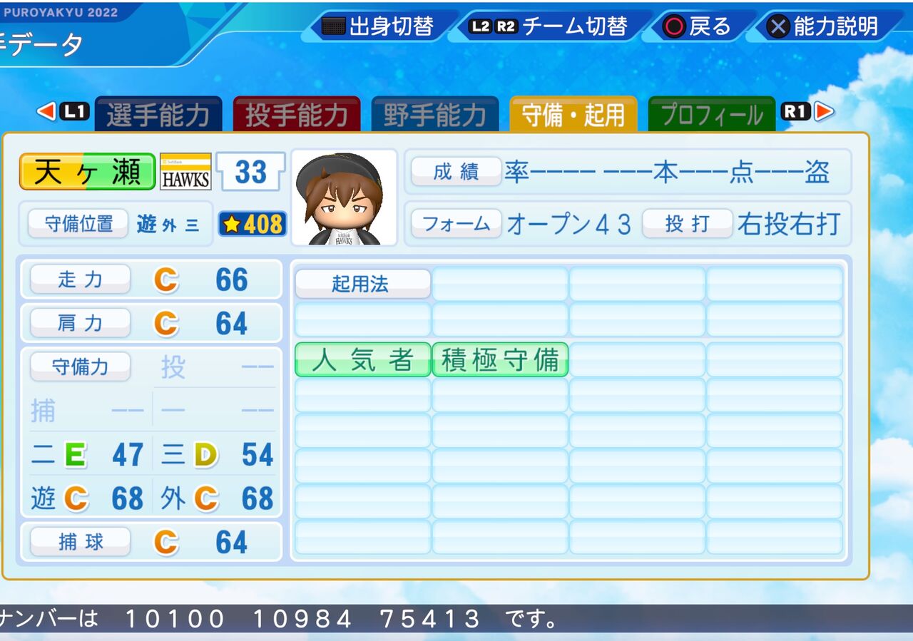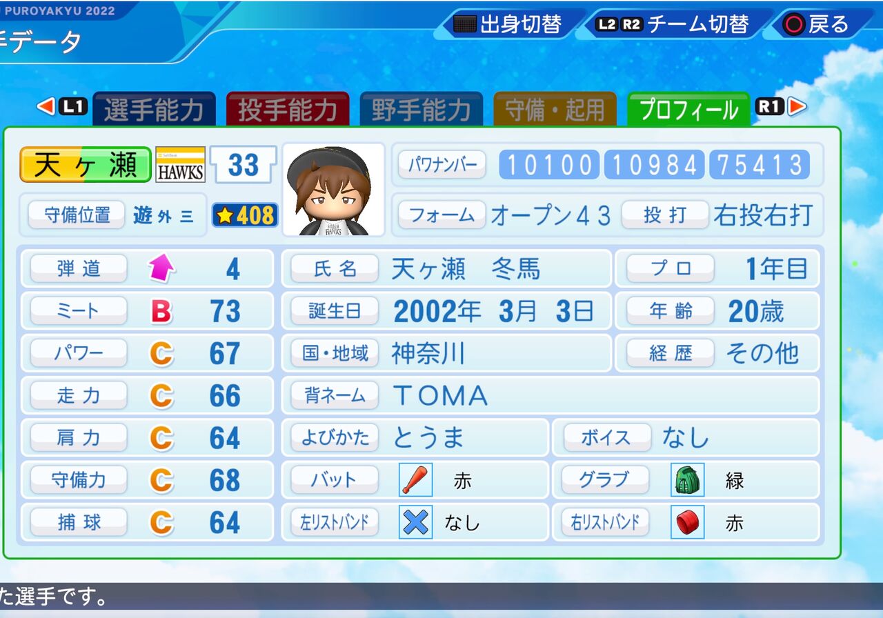 広角打法持ちのバランスのいい能力の遊撃手です。以前作成したものはこちらから。