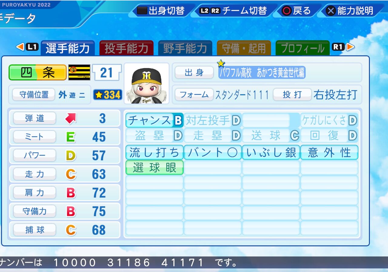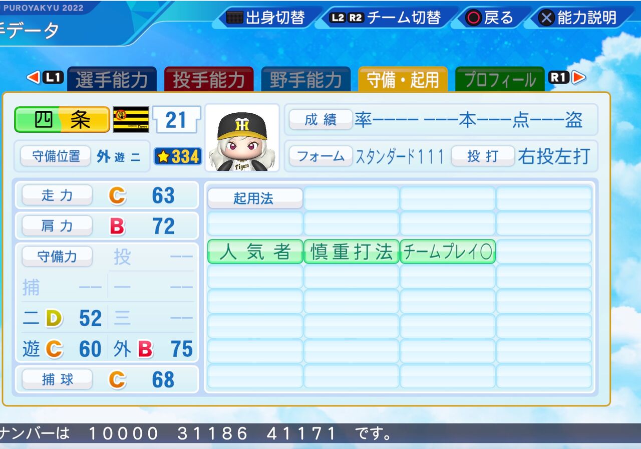 2023年02月02日 四条 貴音 パワプロ2022版 謎めいた雰囲気の孤高のプリンセス系のアイドルです。 肩力と守備力が高めの外野手です。以前作成したものはこちらから。打撃フォーム 田中賢(日本ハムOB)パワター選手データの画像ファイル 「アイマス(765プロAS) パワプロ2022」カテゴリの最新記事 タグ :#外野手#765プロAS#アイマス青属性#プロジェクトルミナス < 前の記事次の記事 > コメント コメントフォーム 名前 コメント 記事の評価 リセット リセット 顔 星 情報を記憶 コメントを投稿する