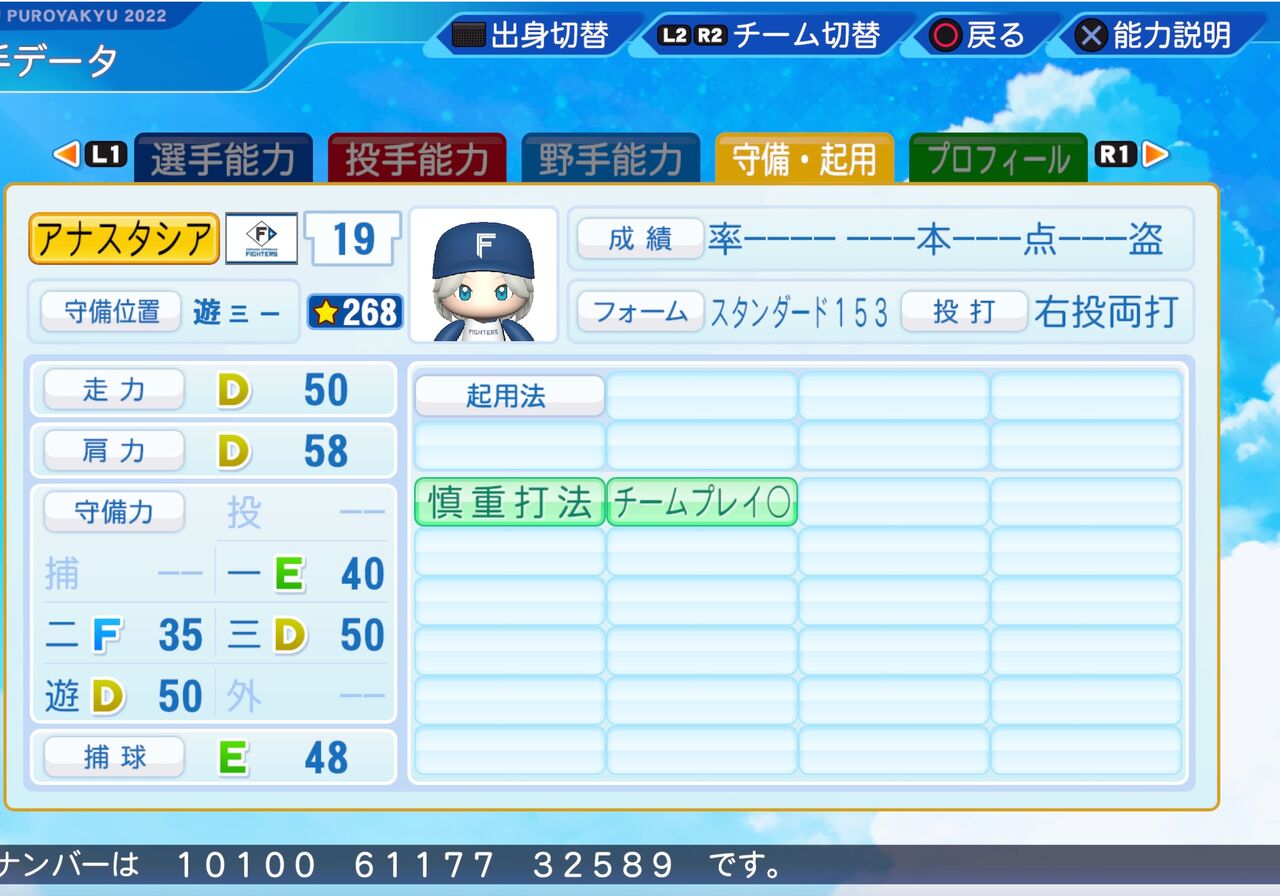 ミートが少し高く、流し打ちが得意な内野手です。よびかたにアナスタシアが無かったためあーにーにしてます。以前作成したものはこちらから。