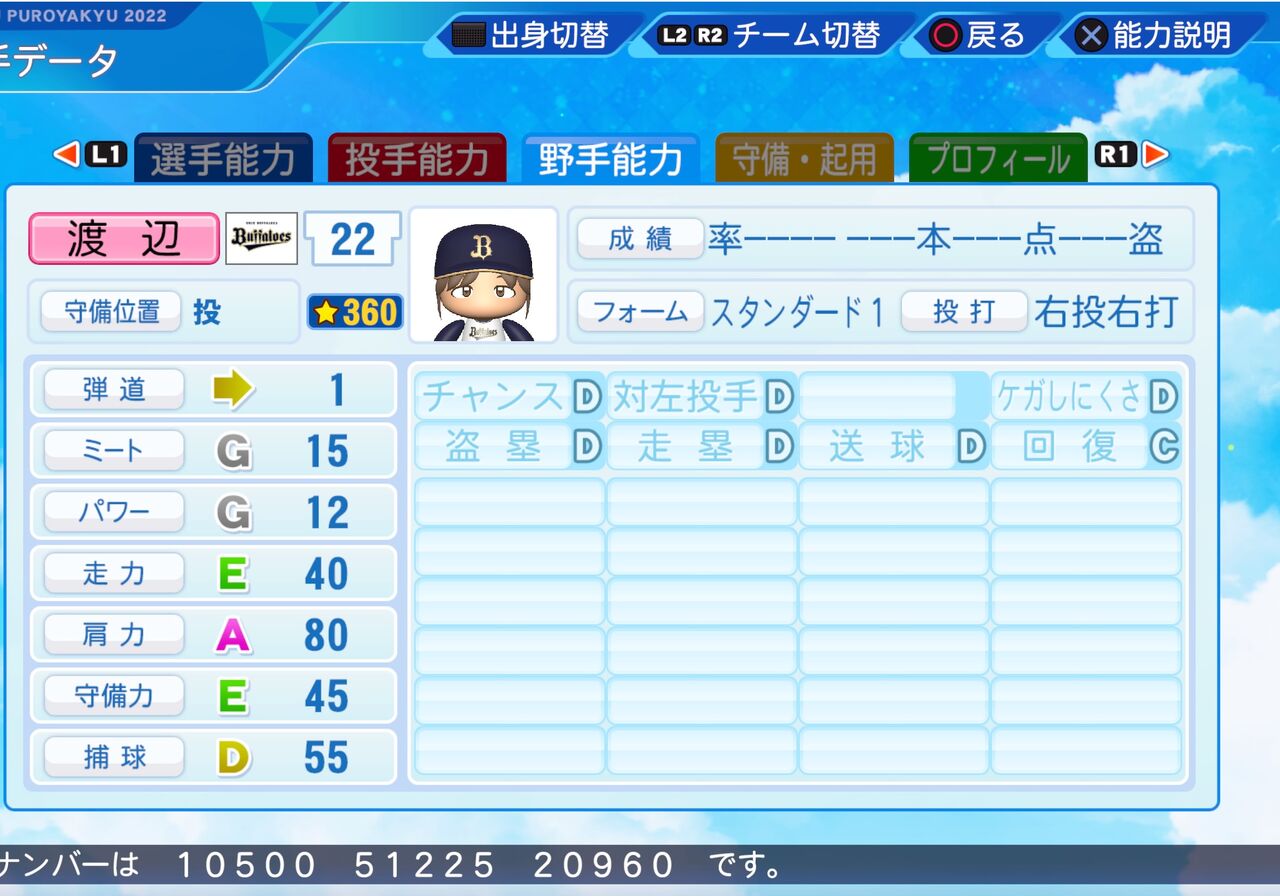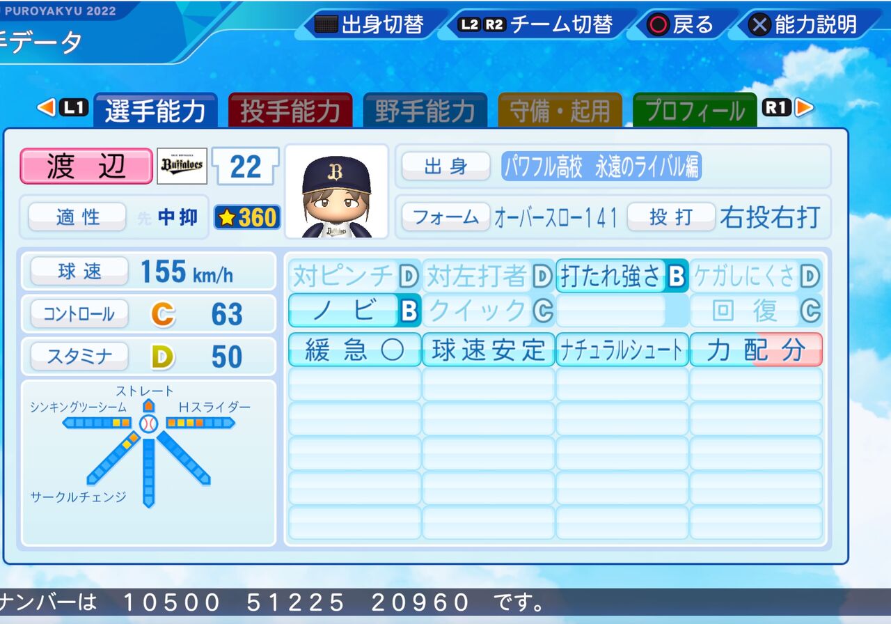 球速が155km/hでノビのあるナチュラルシュートのストレートが武器の剛速球リリーフ投手です。以前作成したものはこちらから。