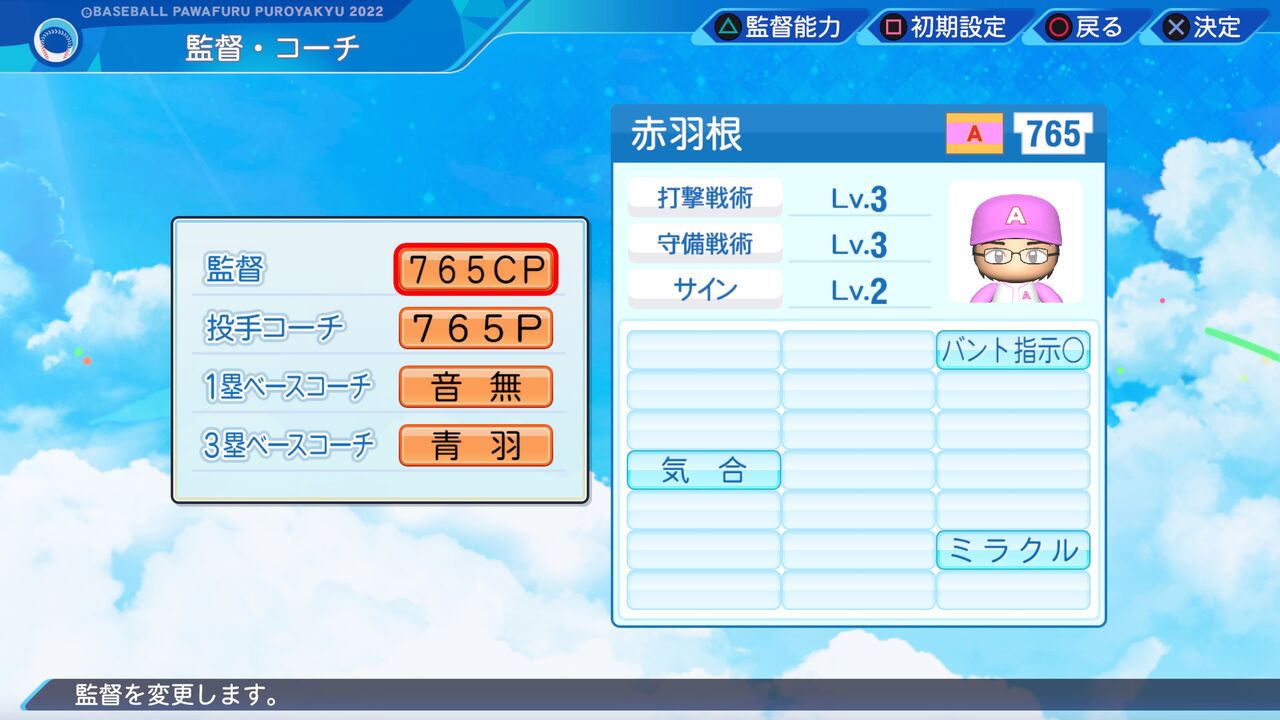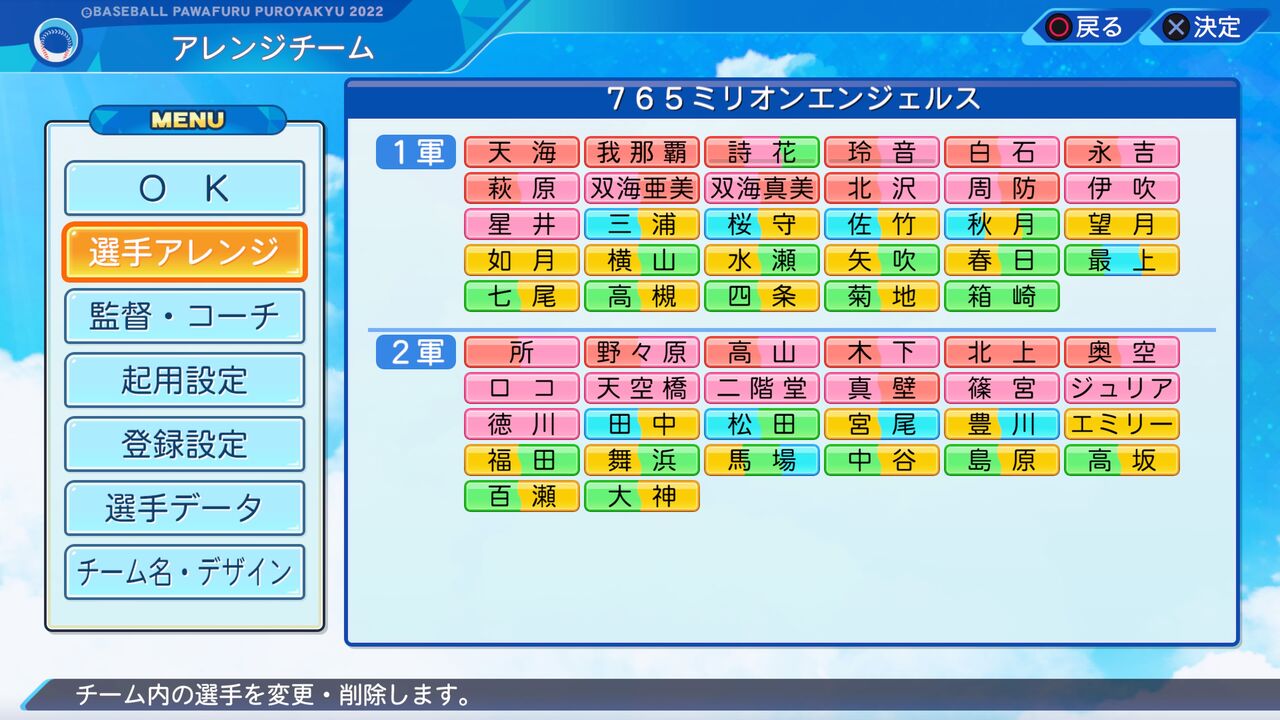 監督、コーチは2022年度版から変更があり、投手コーチはアニメ版ミリオンライブのプロデューサーに変更しました。