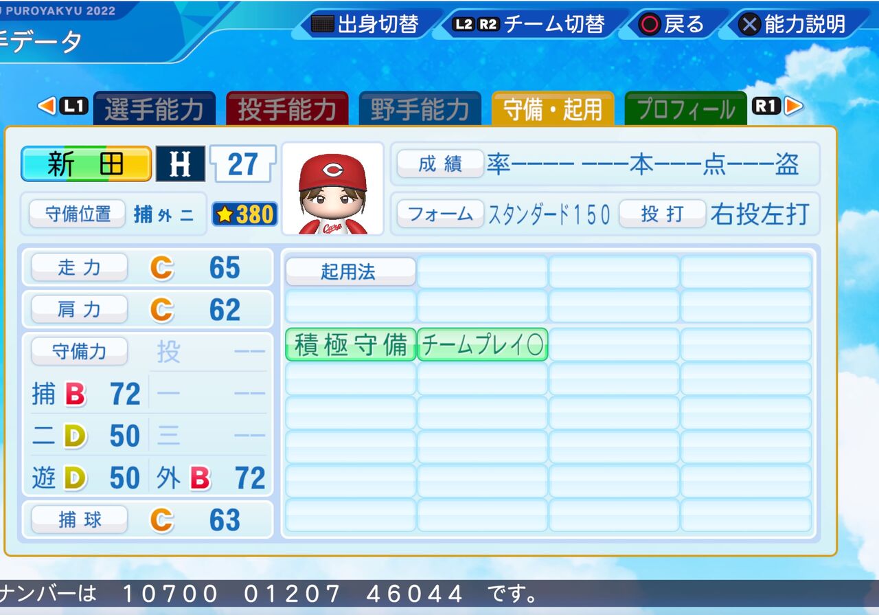 投手のリードがうまく、打撃力も高めの捕手です。以前作成したものはこちらから。