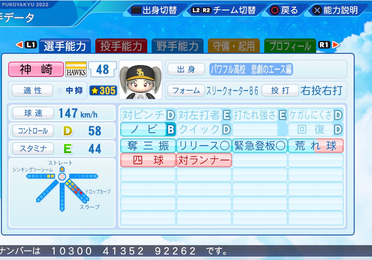 荒れ球だがノビのある速球と変化の大きいドロップカーブが武器のリリーフ投手です。以前作成したものはこちらから。