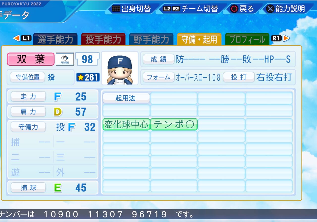 体力が低いためスタミナに難があるが、要所の場面に強く多彩な変化球が武器のリリーフ投手です。以前作成したものはこちらから。
