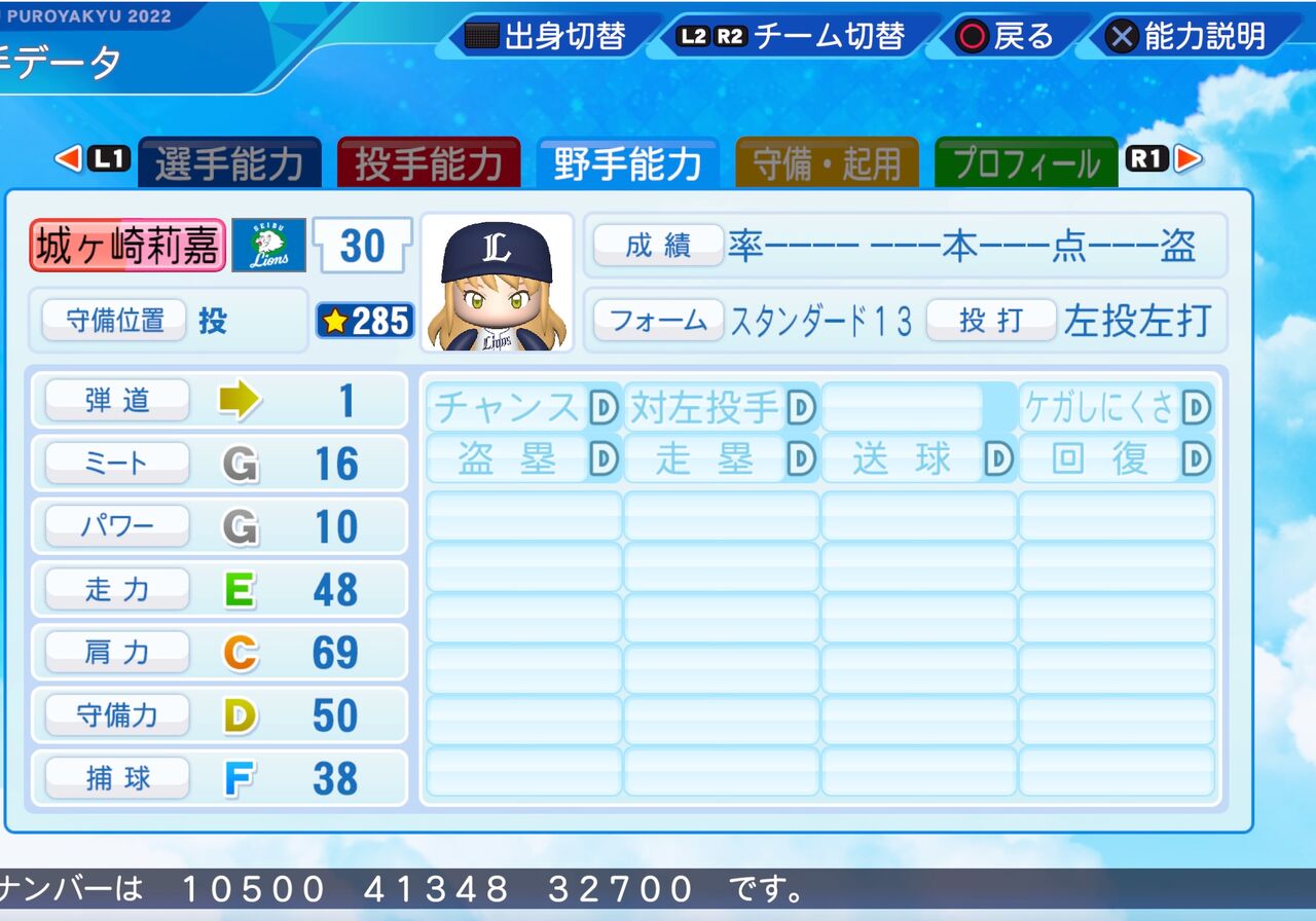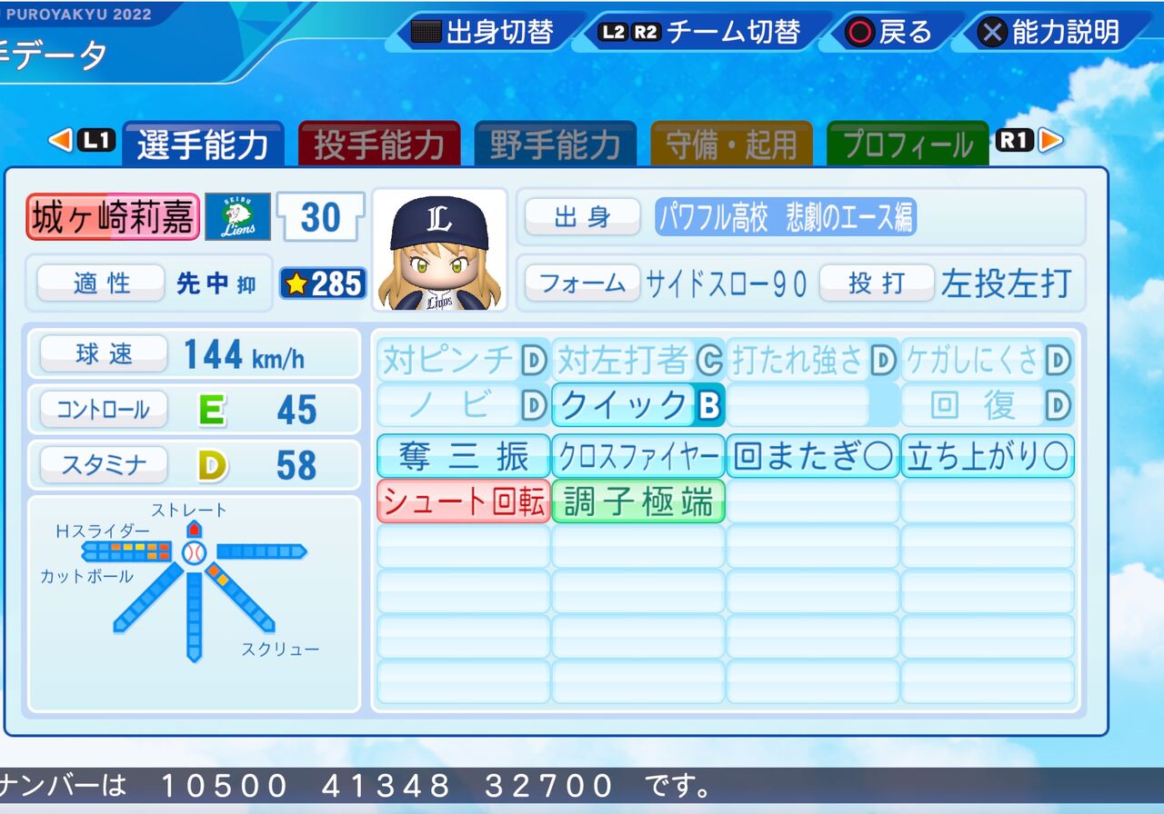 2023年05月30日 城ヶ崎 莉嘉 パワプロ2022版 尊敬する姉の美嘉の背中を追いかけてアイドルになったカリスマJCアイドルです。 左打者に強くクロスファイヤー持ちのサイドスロー左腕投手です。またよびかたにじょうがさきやりかは無かったため近い形でりさにしてます。以前作成したものはこちらから。(年齢は12歳です。)投球フォーム 宮西(日本ハム)パワター選手データの画像ファイル今日のプロ野球の結果日本ハム 2 - 1 ヤクルト(ヤクルトは泥沼11連敗・・・)楽天 2 - 3 DeNA西武 1 - 3 阪神(阪神は怒涛の9連勝)ロッテ 2 - 1 巨人オリックス 4 - 0 広島ソフトバンク 13 - 5 中日 「シンデレラガールズ パワプロ2022」カテゴリの最新記事 タグ :#投手(先・リ)#左投げ投手(サウスポー)#346プロ#シンデレラプロジェクト#アイマス黄属性 < 前の記事次の記事 > コメント コメントフォーム 名前 コメント 記事の評価 リセット リセット 顔 星 情報を記憶 コメントを投稿する