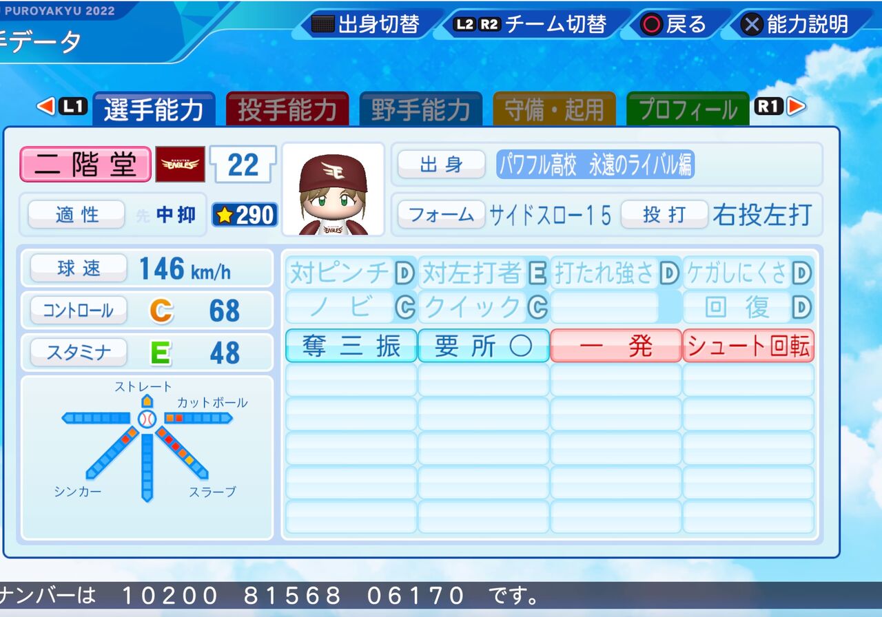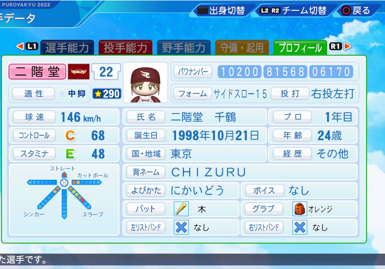 コントロールがやや高く、要所の場面で強くなるリリーフ投手です。以前作成したものはこちらから。(投手に変更しました。)
