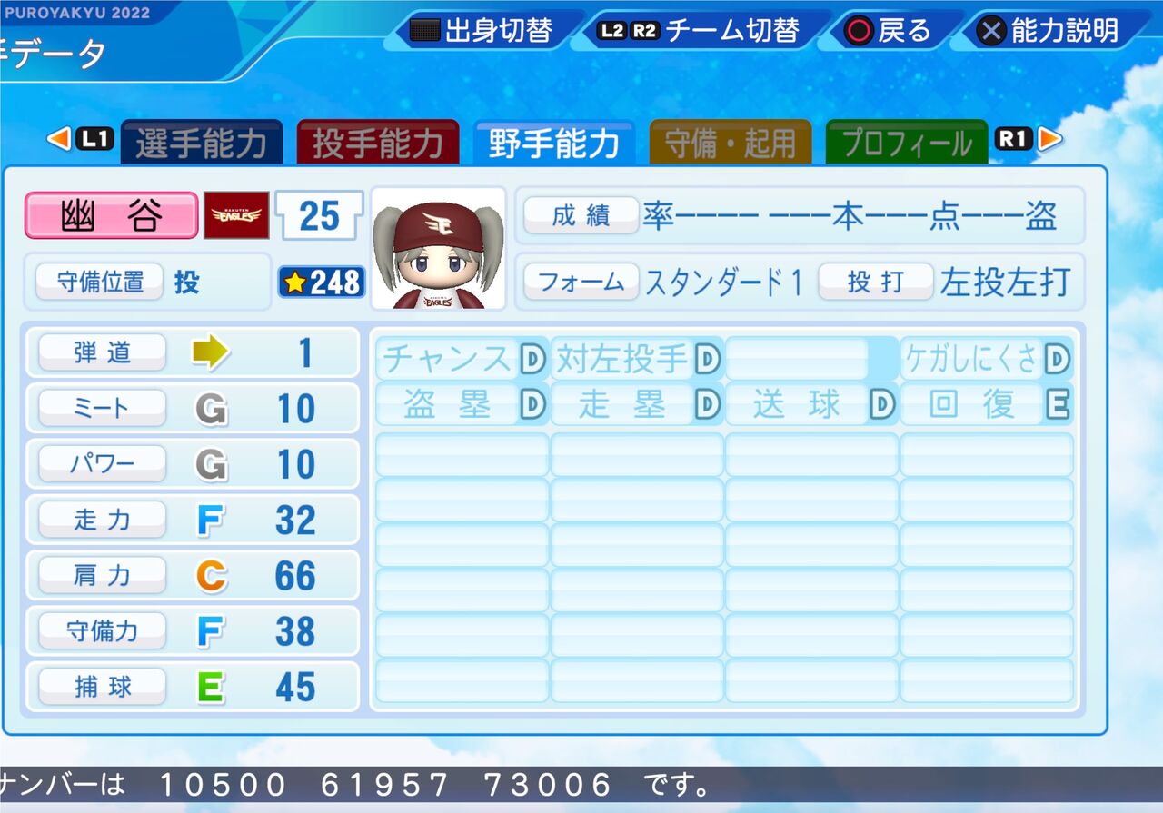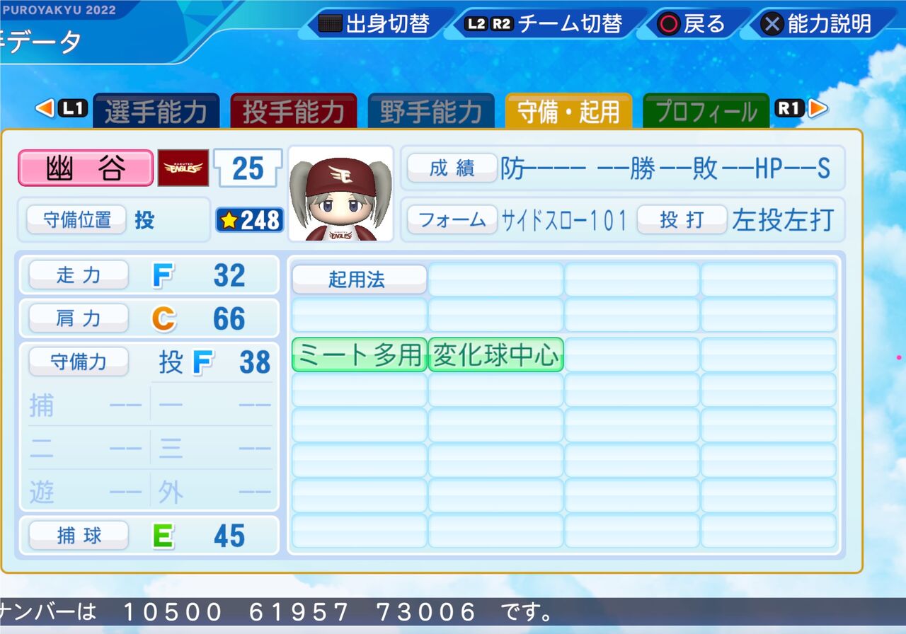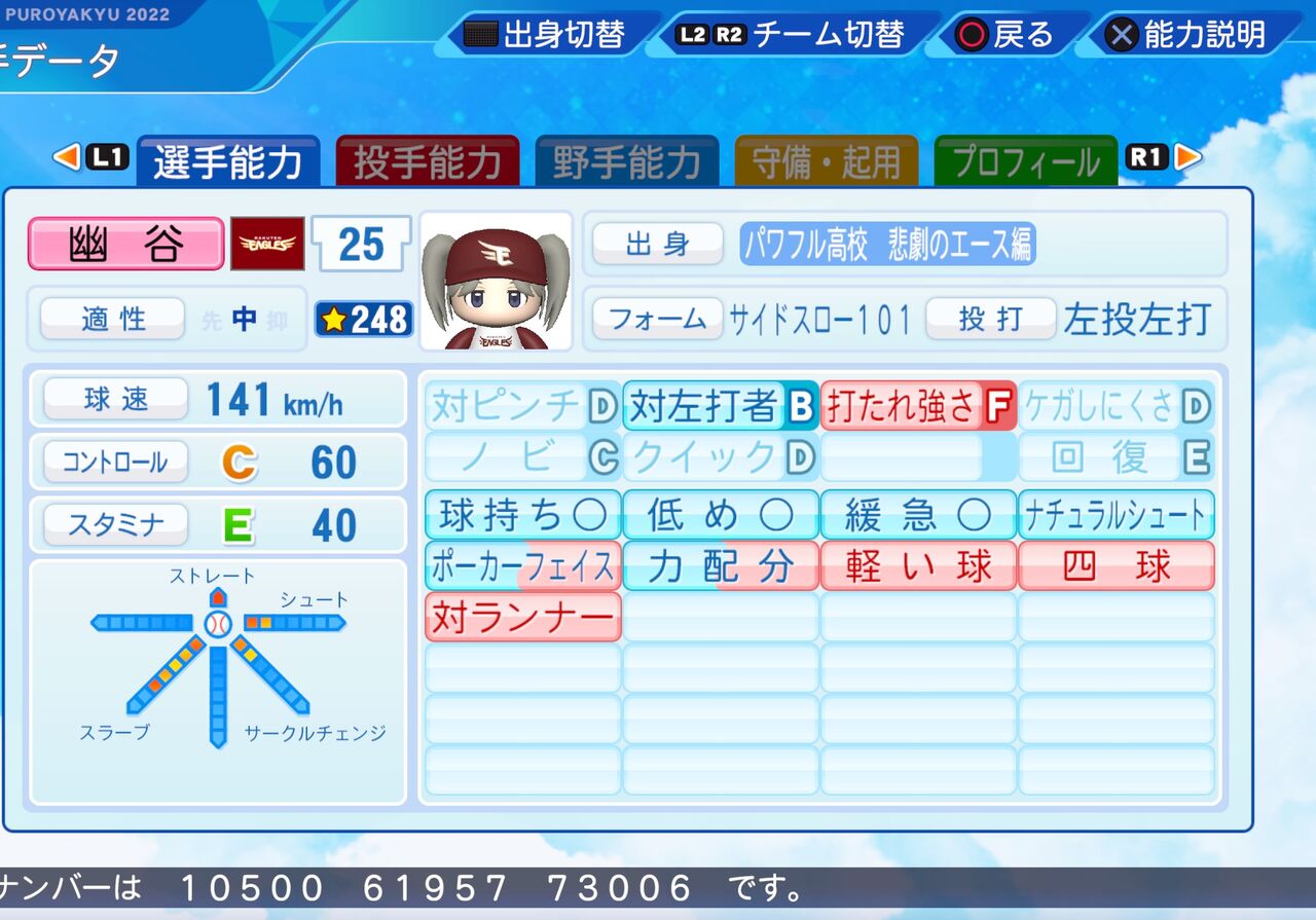 2023年11月25日 幽谷 霧子 パワプロ2022版 儚げな雰囲気が印象的な、ミステリアスなアイドルです。 スラーブが武器の左打者に強いリリーフ投手です。以前作成したものはこちらから。投球フォーム 高梨(巨人)パワター選手データの画像ファイル 「シャイニーカラーズ パワプロ2022」カテゴリの最新記事 タグ :#投手(リリーフ)#左投げ投手(サウスポー)#283プロ#アイマス青属性 < 前の記事次の記事 > コメント コメントフォーム 名前 コメント 記事の評価 リセット リセット 顔 星 情報を記憶 コメントを投稿する
