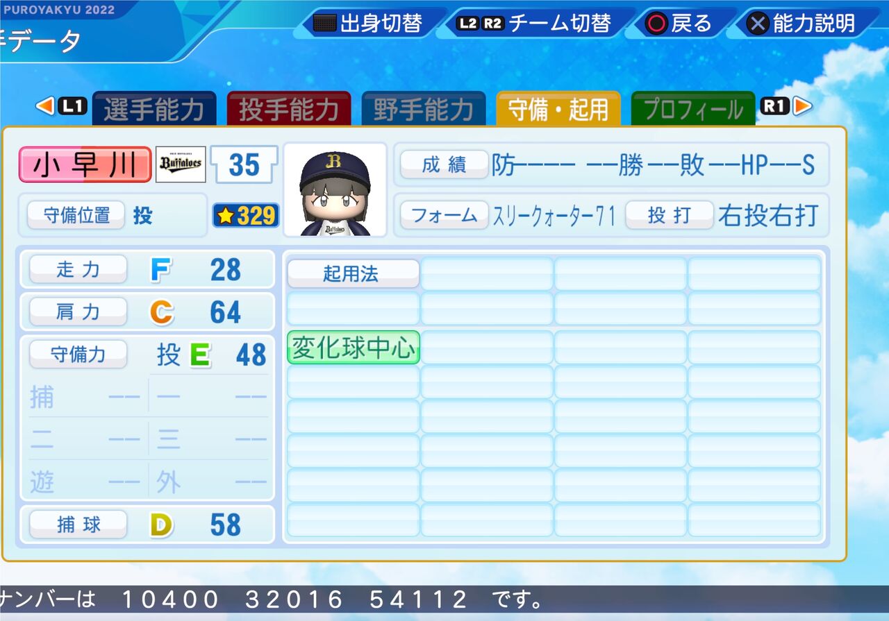 コントロールが高く、変幻自在の変化球を投げるリリーフ投手です。以前作成したものはこちらから。