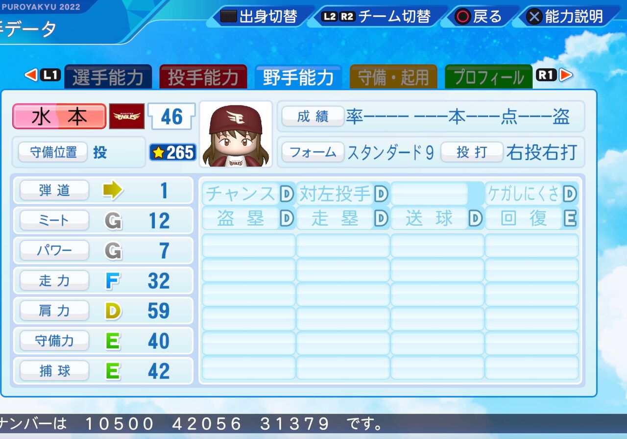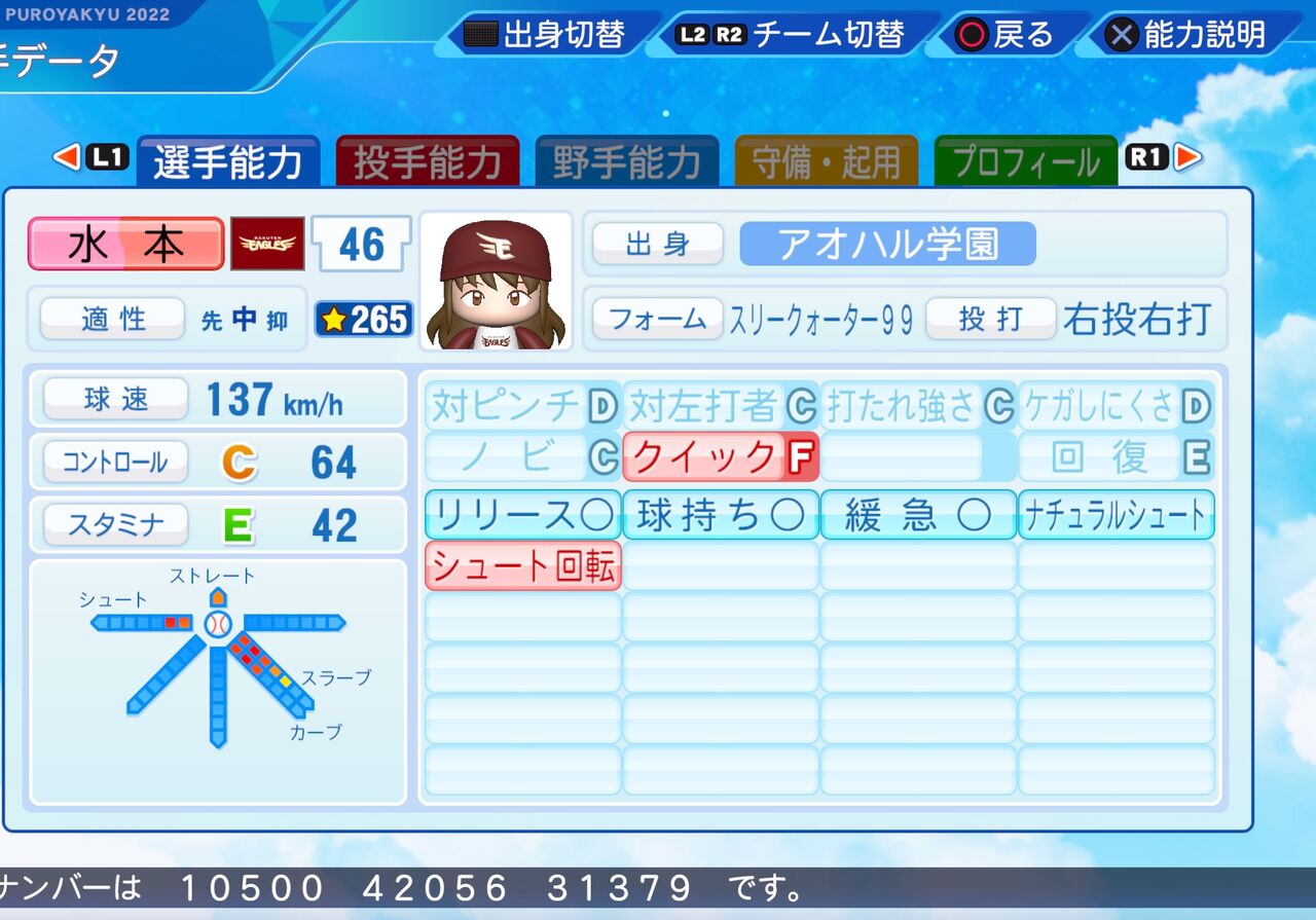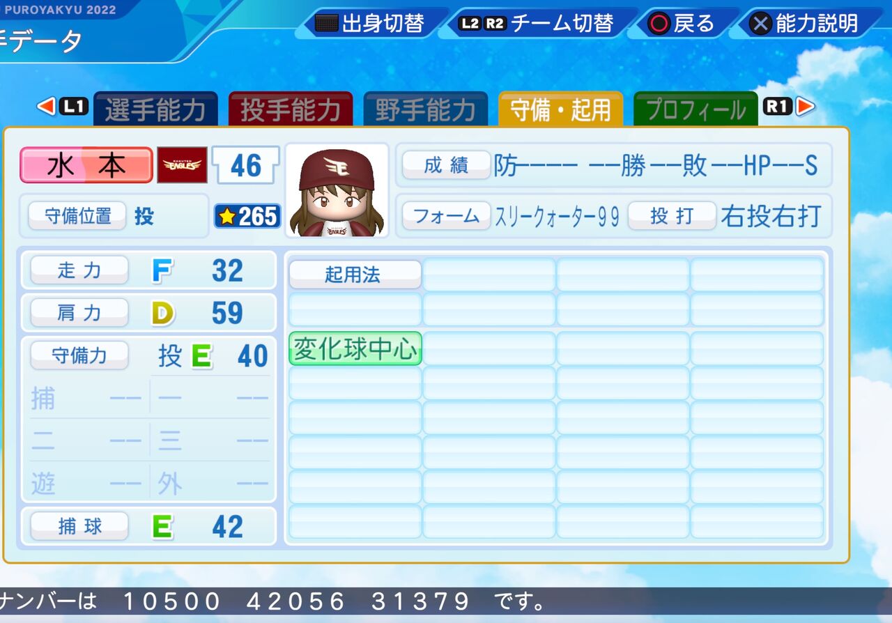コントロールがやや高めでナチュラルシュート持ちのリリーフ投手です。以前作成したものはこちらから。