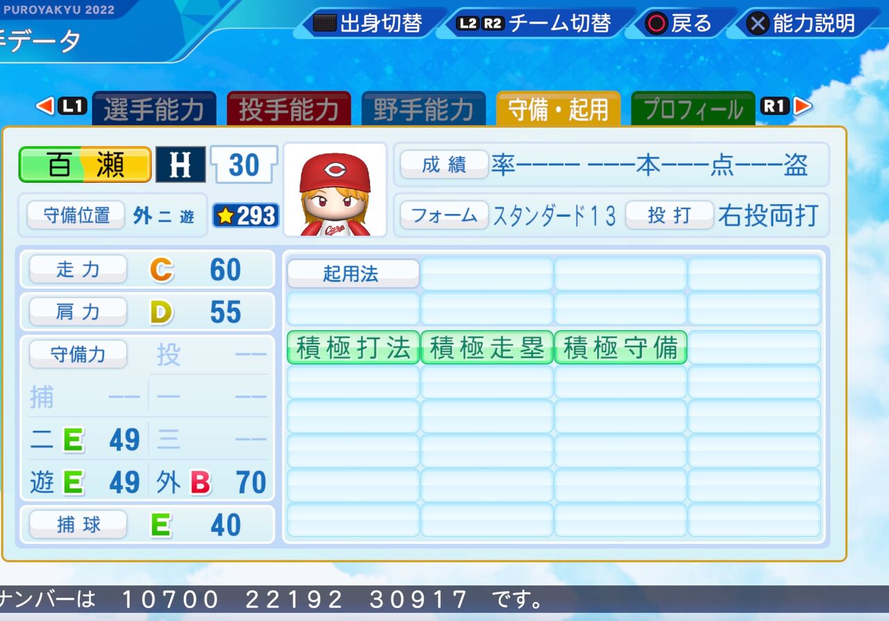 2024年01月20日 百瀬 莉緒 パワプロ2022版 大人のセクシー(アピールしすぎることもある)お姉さんのアイドルです。 守備力が高めのプルヒッターのアイドルです。以前作成したものはこちらから。パワター選手データの画像ファイル 「ミリオンライブ パワプロ2022」カテゴリの最新記事 タグ :#外野手#ミリオンスターズ(765プロ)#アイマス青属性 < 前の記事次の記事 > コメント コメントフォーム 名前 コメント 記事の評価 リセット リセット 顔 星 情報を記憶 コメントを投稿する